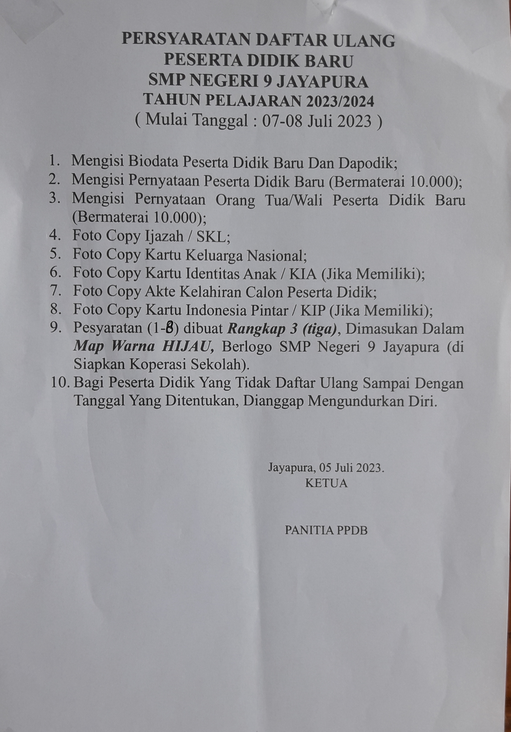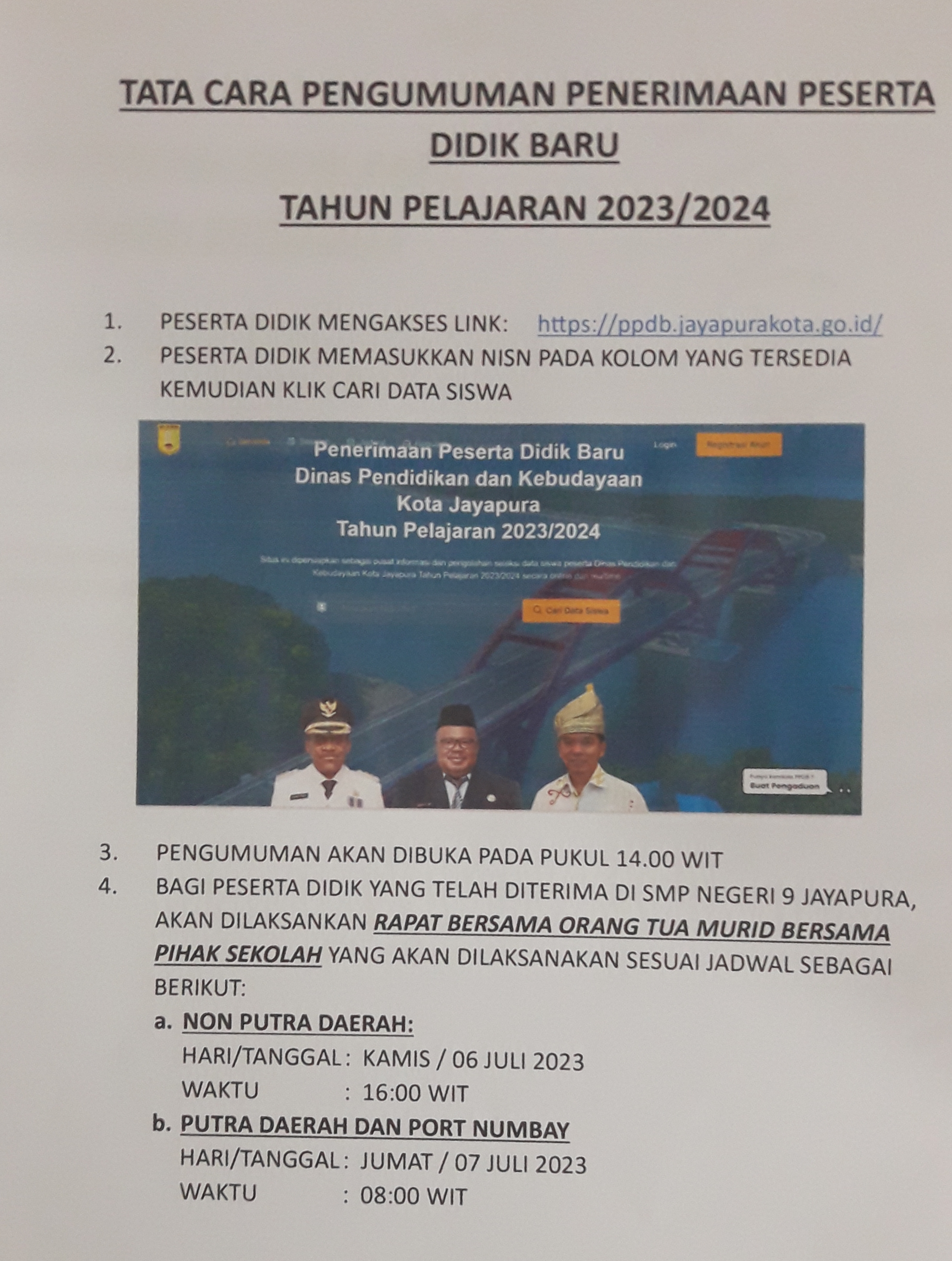 - Pengumuman: tanggal 6 juli 2023 melalui link : ppdb.jayapurakota.go.id