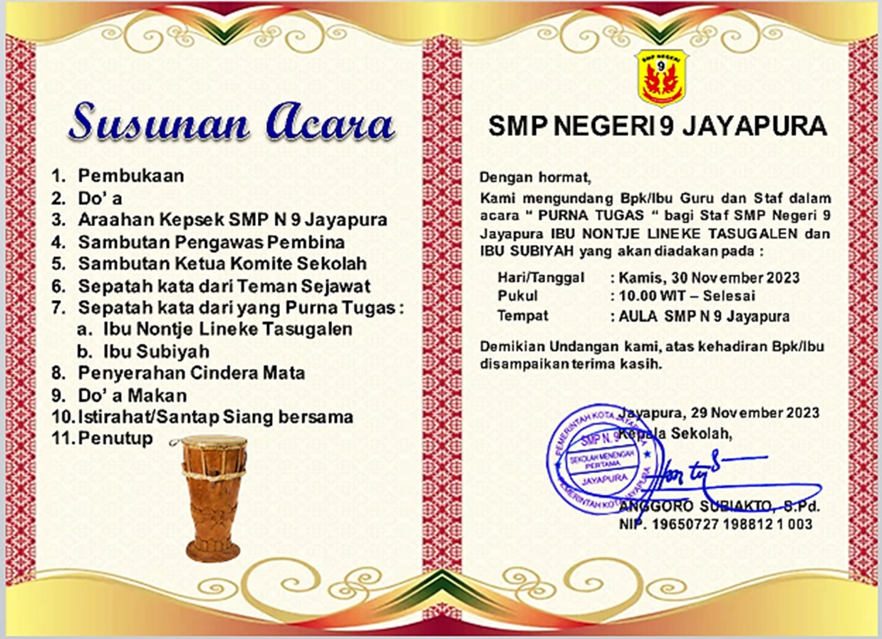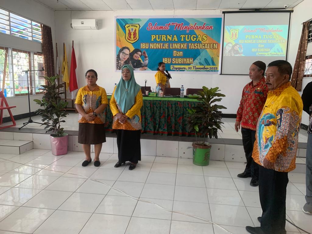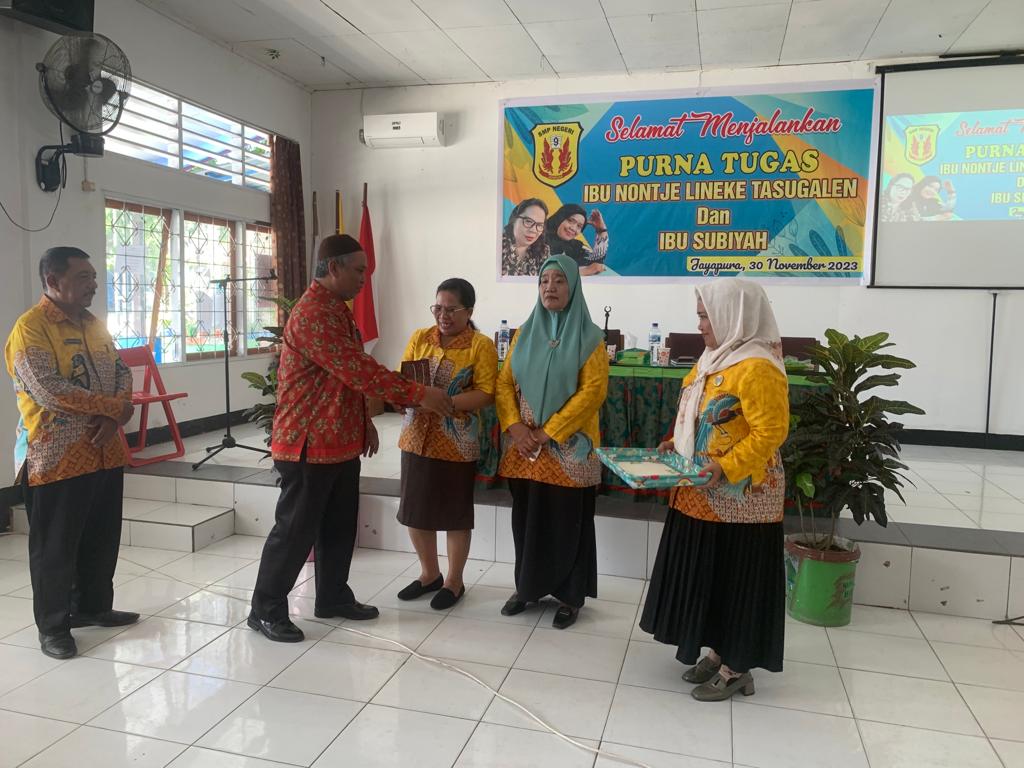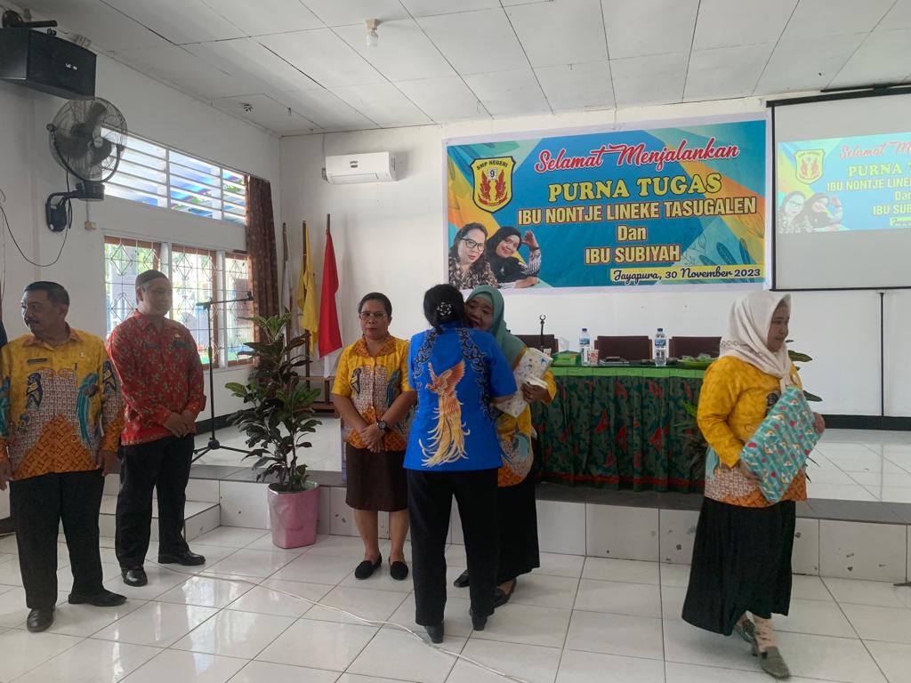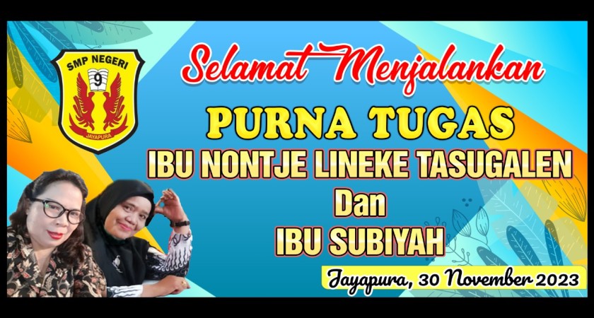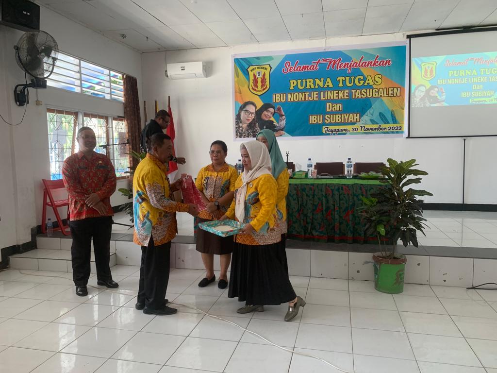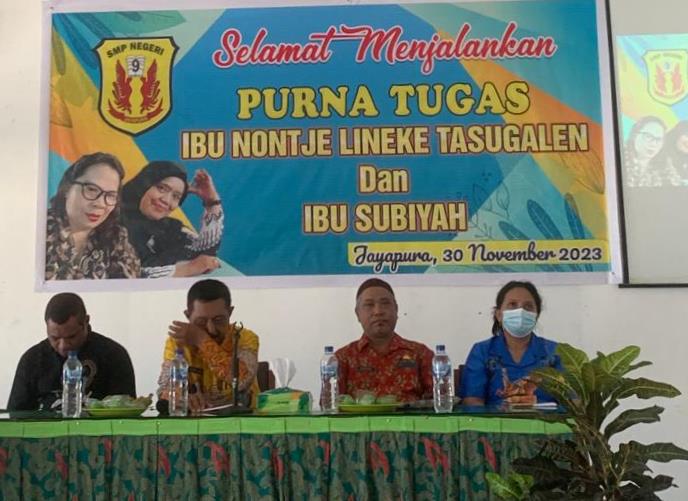 SMP Negeri 9 Jayapura_Menggelar acara Pelepasan purna tugas dua guru SMPN 9 Jayapura, guru tersebut atas nama Ibu Nontje Lineke Tasugalen dan Ibu Subiyah, S. Pd, Kamis (30 Nopember 2023) di Aula SMPN 9 Jayapura. kegiatan pelepasan purna tugas diikuti oleh semua guru dan tenaga kependidikan SMPN 9 Jayapura.