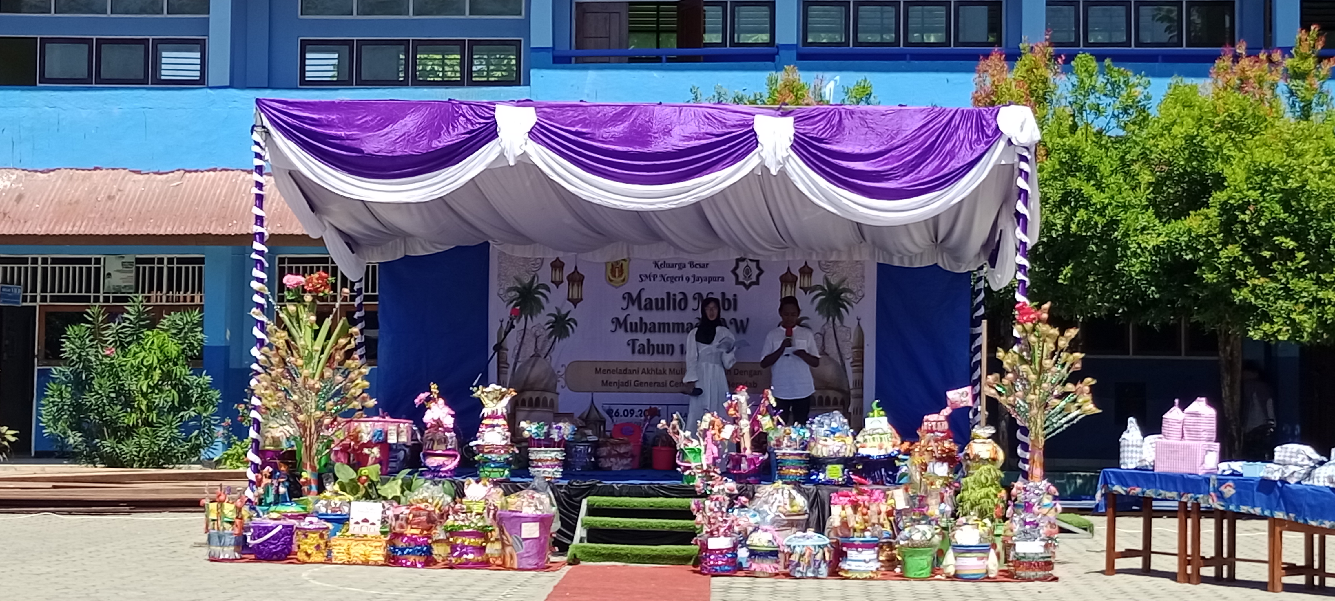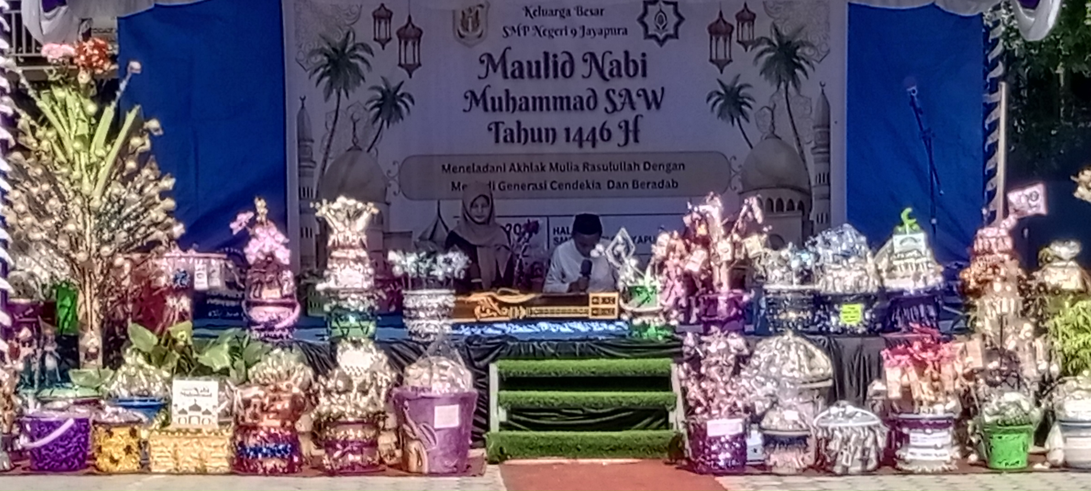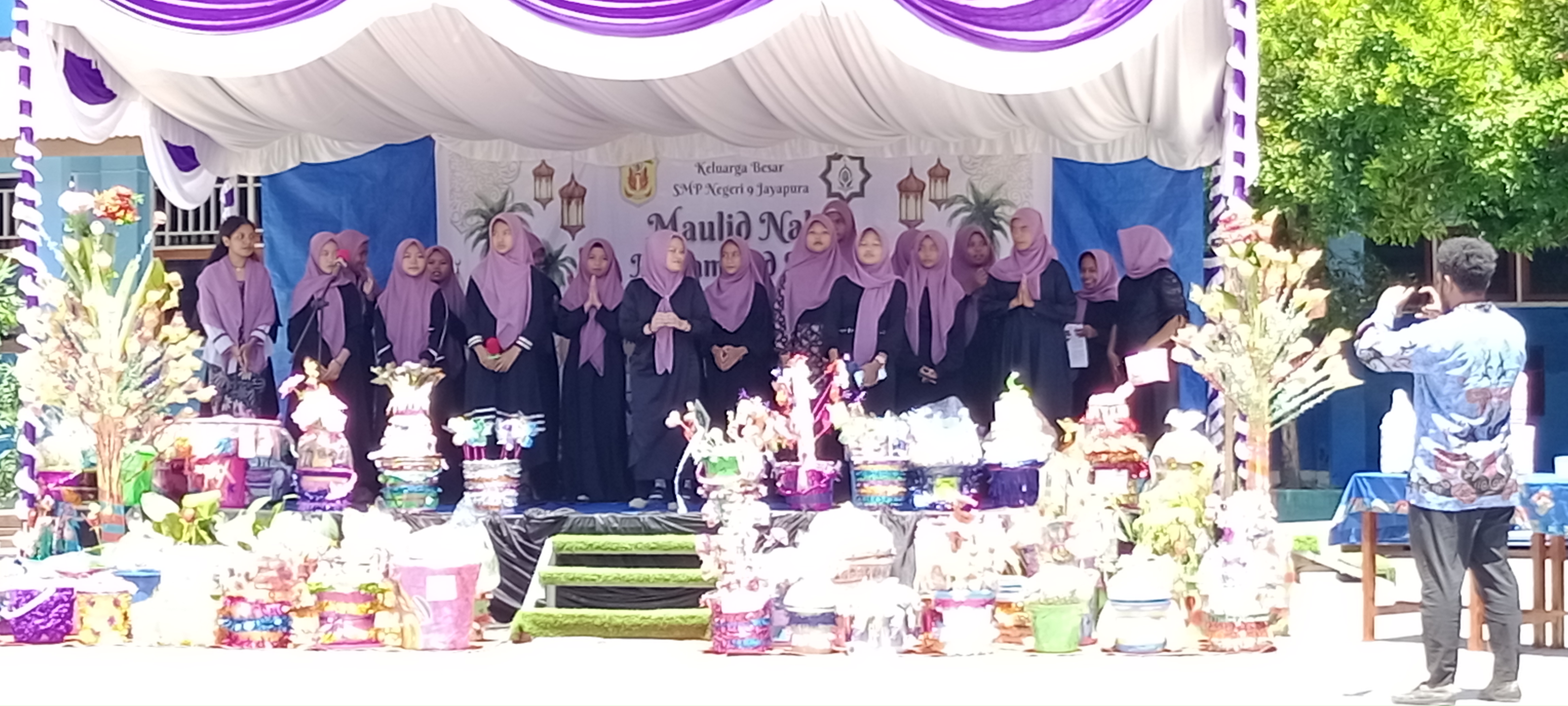 SMPNegeri 9 jayapura_Pada tanggal 26 September 2024, umat Islam di seluruh dunia memperingati hari kelahiran Nabi Muhammad SAW. Di SMP Negeri 9 Jayapura, perayaan Maulid Nabi dijadikan momen syukuran yang penuh berkah, dihadiri oleh seluruh siswa, guru, serta tamu undangan dari Pengawas Dinas Pendidikan. Acara ini digelar dengan tujuan untuk mengenang keteladanan Rasulullah SAW dan memperkuat nilai-nilai keislaman di lingkungan sekolah.