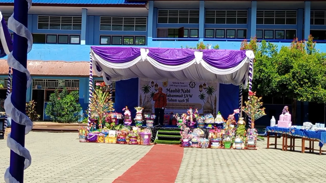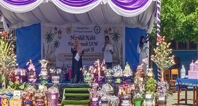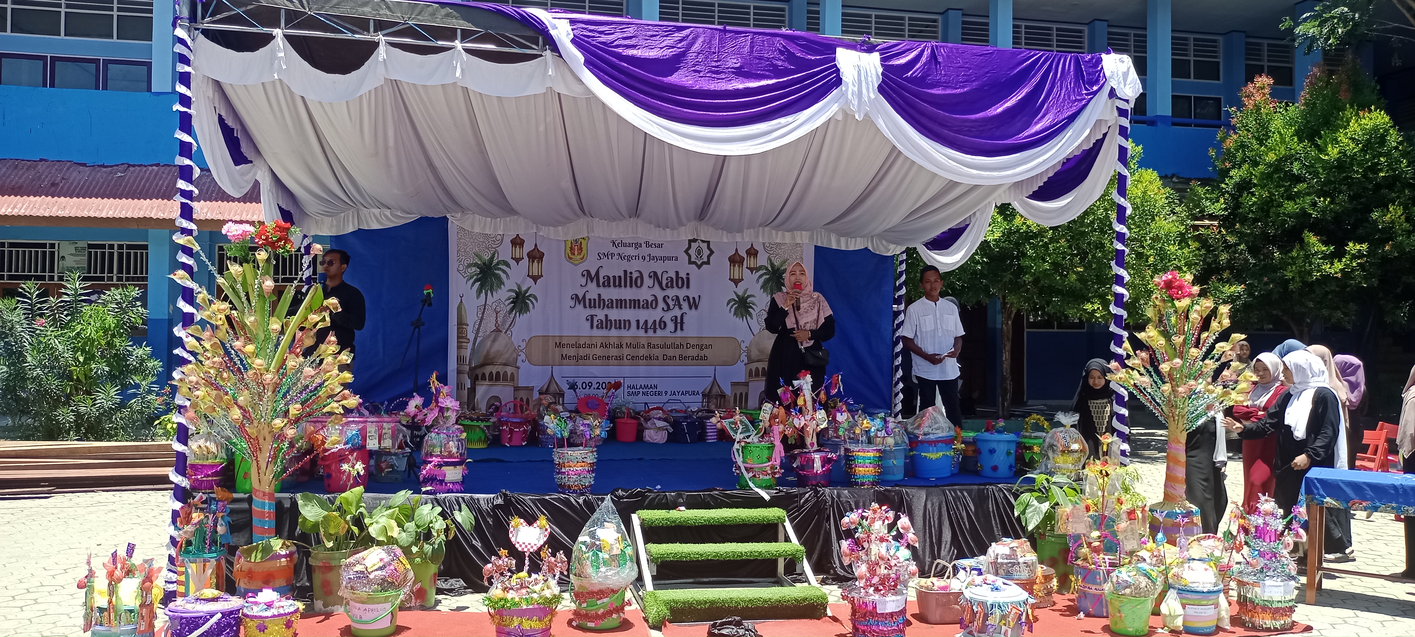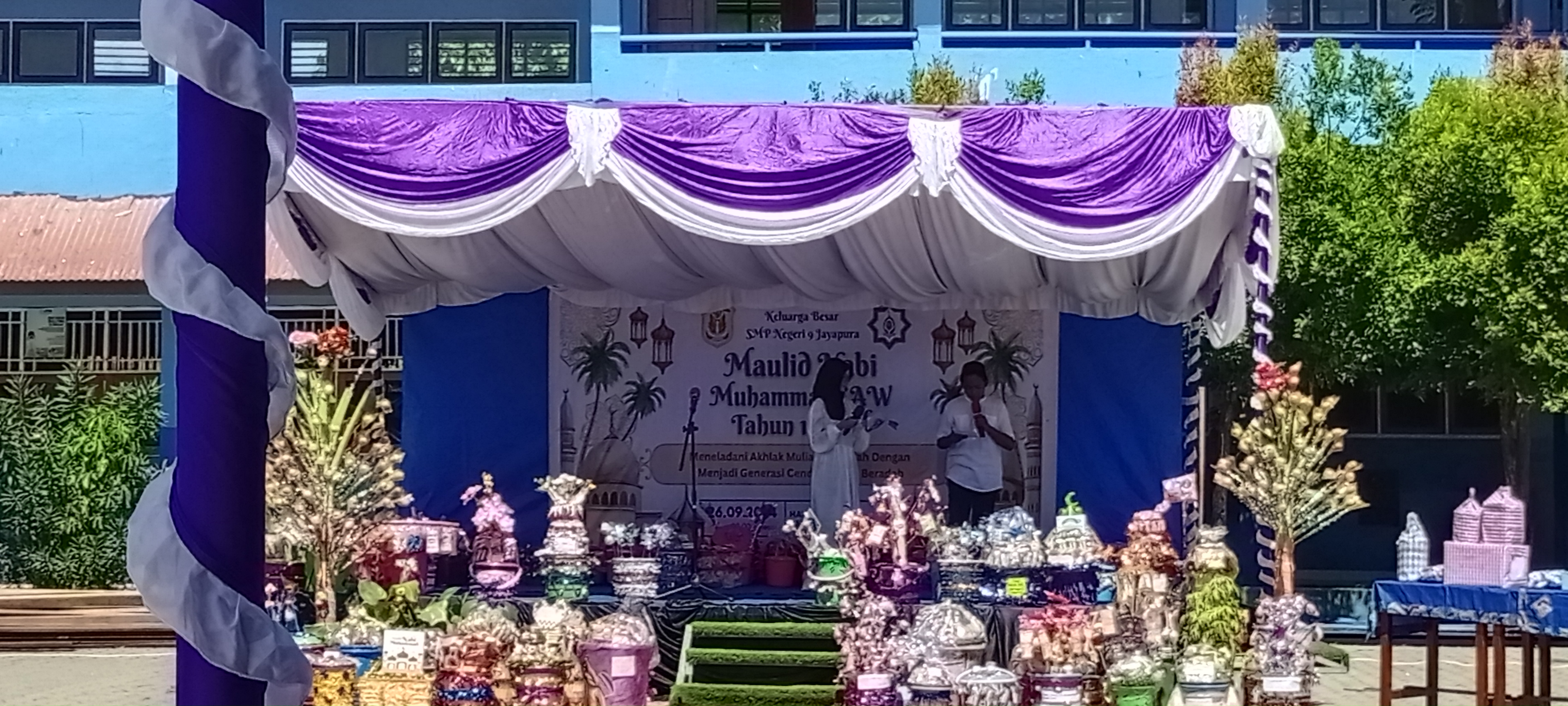 SMPNegeri 9 jayapura_Pada tanggal 26 September 2024, umat Islam di seluruh dunia memperingati hari kelahiran Nabi Muhammad SAW. Di SMP Negeri 9 Jayapura, perayaan Maulid Nabi dijadikan momen syukuran yang penuh berkah, dihadiri oleh seluruh siswa, guru, serta tamu undangan dari Pengawas Dinas Pendidikan. Acara ini digelar dengan tujuan untuk mengenang keteladanan Rasulullah SAW dan memperkuat nilai-nilai keislaman di lingkungan sekolah.
